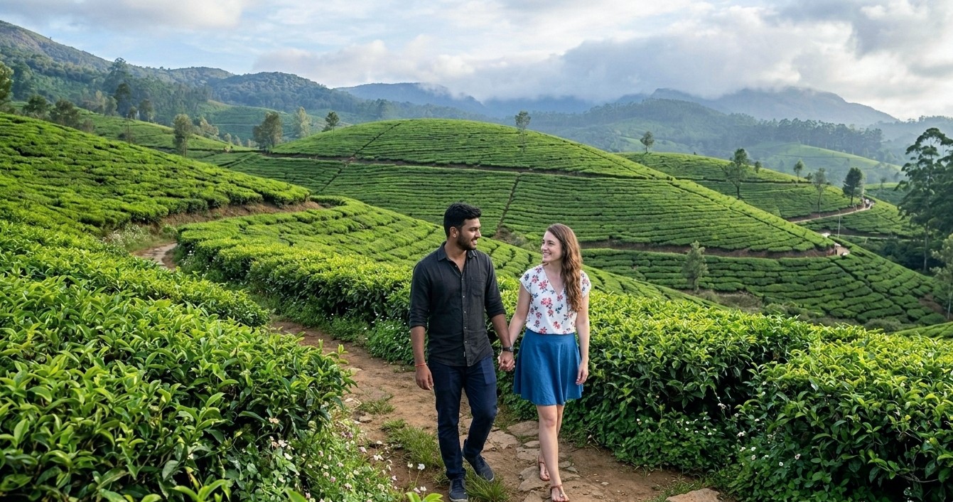 Explore tea plantations, photo points, dams, and hill viewpoints. Visit Eravikulam National Park (optional) and enjoy the cool climate together. Overnight stay in Munnar.